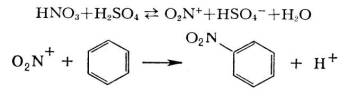 Кинетика процесса в первом случае отвечает первому, во втором - второму порядку (см. Кинетика химическая). Электрофильное замещение наиболее характерно для ароматических соединений, например: