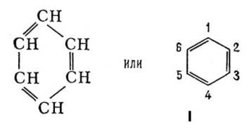 свойства Б формально в некоторой степени соответствуют формуле (1). Так, в определенных условиях к молекуле Б присоединяются 3 молекулы или 3 молекулы Б образуется при конденсации 3 молекул ацетилена. Однако для Б характерны в основном не реакции присоединения, типичные для ненасыщенных соединений, а реакции электрофильного замещения. Кроме того, бензольное ядро очень устойчиво к действию окислителей, например перманганата что также противоречит наличию в Б локализованных двойных связей. Особые, т. н. ароматические, свойства Б объясняются тем, что все связи в его молекуле выравнены, т. е. расстояния между соседними одинаковы и равны 0,14 нм (1,40 ), длина простой связи С-С 0,154 нм (1,54 ) и двойной С = С 0,132 нм (1,32 ). Молекула Б имеет ось симметрии шестого порядка; для Б как ароматического соединения характерно наличие секстета p-электронов, образующих единую замкнутую устойчивую электронную систему. Однако до сих пор нет общепринятой формулы, отражающей его строение; часто используют формулу .