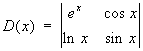 Функциональный определитель | Функциональный определитель (далее Ф) определитель, элементами которого являются функции одного или многих переменных. Наиболее важные примеры Ф — вронскиан, играющий важную роль в теории линейных дифференциальных уравнений высшего порядка, гессиан, применяемый в теории алгебраических кривых, и якобиан, используемый при преобразовании кратных интегралов, установлении независимости системы функций и др. вопросах теории функций многих переменных. Производная Ф D (x) = |aik (x)| n-го порядка равна сумме n Ф, матрицы которых получаются из матрицы ||aik (x)|| соответственно дифференцированием элементов первого, второго,..., n-го столбца. Например, если