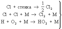 В последних двух стадиях М - любая третья частица ( или молекула), которая нужна для того, чтобы отнять часть энергии у образующихся частиц 2 и 2 и тем самым сделать невозможным их обратный распад.