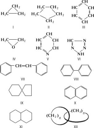 Наиболее распространены (вследствие легкости образования и отсутствия напряжения в циклах) 5- и 6-звенные кольца. В зависимости от природы образующих циклы, Ц подразделяют на изоциклические, или карбоциклические соединения, циклы которых состоят только из например алициклические соединения — циклопропан (1) и циклопентан (), ароматические соединения — бензол (); гетероциклические соединения, в циклах которых, кроме имеется также один или несколько др. элементов, т. н. гетероатомов, главным образом серы, например этилена окись (), пиридин (), тетразол (). В многоядерных Ц кольца могут быть изолированными друг от друга, как, например, в стильбене (), связанными одной простой связью, как в дифениле (), иметь один общий ((IX), см. Спираны) или два (т. н. конденсированные Ц), например нафталин (X), декалин (XI). Особый случай Ц — катенаны (XII), молекулы которых построены по принципу обычной цепи (звено в звене). Примером неорганических Ц могут служить некоторые соединения бора, например боразол, например фосфонитрилхлориды, — циклосплоксаны. См. также Органическая химия.